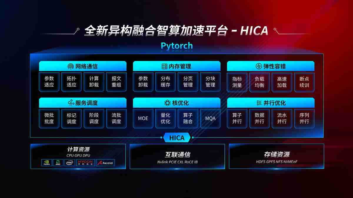 通过自研的服务层、、、中间适配层、、、以及调度编排算法,,,采用数据并行、、模型并行等多种并行方式,,,把并行计算任务进行有效的分解,,,,使其分别由相应的软件栈和算力资源来承接。。。。当GPU资源变化,,,HICA可以实时动态调度计算子任务并调整模型拓扑和架构,,以充分聚合各种算力资源。。。。